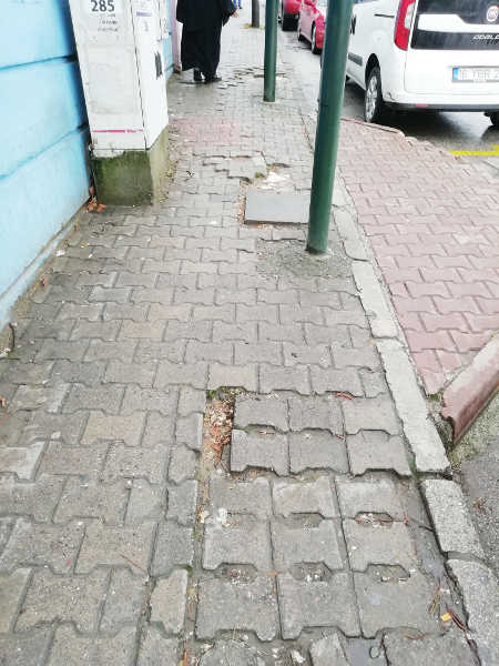 Burası hastaneler bölgesi ve kaldırımların hali ortada. Kaldırımlar dar olduğu gibi, bırakın yayaları, engellilerin bile yürüyemeyeceği kadar bozuk. Trafo, trafik lambası, çukurlarla dolu.