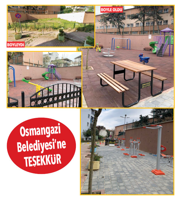 Jimnastik aletleri, banklar ve çocuk oyun alanıyla mahallemize böyle güzel bir park kazandırdığı için mahalle sakinleri olarak Osmangazi Belediyesi’ne ve sahada çalışan ekibe Söz Sizde köşesi aracılığıyla teşekkür ediyoruz.