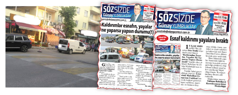 Günay Bey, 15 Eylül 2020 tarihinde Söz Sizde köşesinde “Kaldırımlar Esnafın, Yayalar Ne Yaparsa Yapsın Durumu(!)” başlığıyla Çınarönü Mahallesi Çınarönü Caddesi üzerindeki kaldırım işgallerinden bahsetmiş ve yayaların kaldırımları kullanamadığını belirtmiştik.