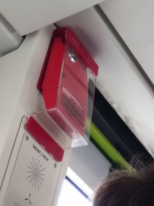 Bursaray’da işe giderken dikkatimi çekti. Yeni vagonlardaki imdat freni öyle bir korumaya alınmış ki, acil durumda bu valfi kullanmak nerdeyse imkânsız. Resmen korumaya alınmış kullanılmasın diye sanki. O zaman niye koydunuz ki aleti buraya!