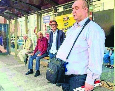 Görmeyen beyaz bastonuyla, işgal edilmiş kaldırımlarda ilerlemeye çalışır ve durağa gelir, mobil uygulamaları kullanıyorsa durağa gelen otobüsün saatini tahmin edebilir.
