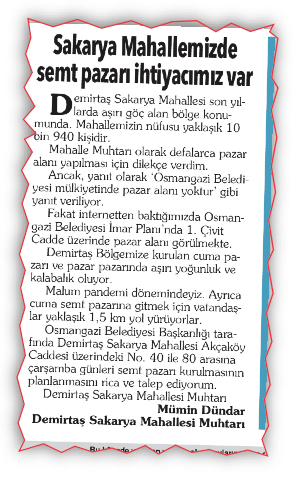 Sayın Günay Yumruktay, Olay gazetesi 1 Aralık 2020 tarihli Söz Sizde köşesinde “Sakarya Mahallemizde Semt Pazarı İhtiyacımız Var’ başlıklı okur yazısında yer verilen talep incelenmiştir.