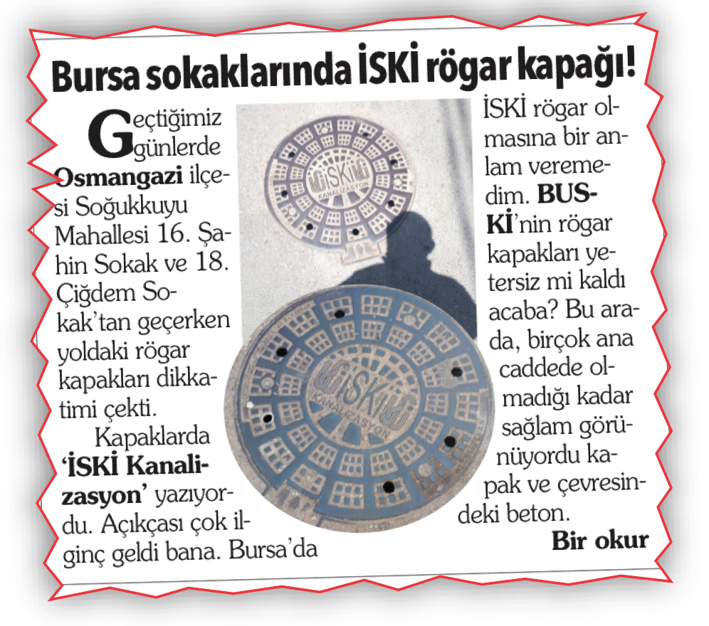 16 Haziran 2022 tarihli Söz Sizde köşesinde Osmangazi ilçesi Soğukkuyu Mahallesi’nde gördüğüm durum üzerine “Bursa Sokaklarında İSKİ Rögar Kapağı” başlıklı yazım üzerine BUSKİ yetkilileri, çok kısa sürede bu durumla ilgili gerekeni yapmışlardır.