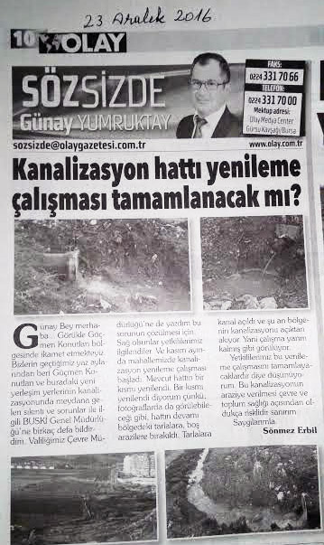 Günay Bey merhaba… Görükle Göçmen Konutları Kurtuluş Mahallesi’nde 2014 yılından bu yana çözülemeyen kanalizasyon sorunu için tekrar yardım ve ilginizi bekliyorum.