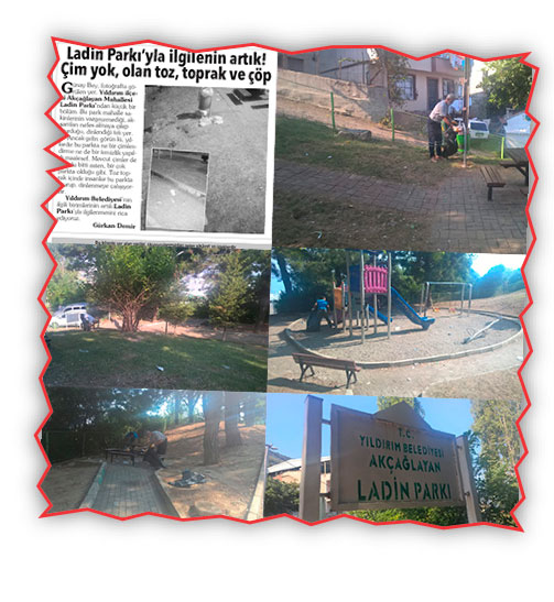 Yıldırım Belediyesi ekiplerinin 4 yıl sonra tekrar Ladin Park’a bir göz atmalarını ve gerekli temizlik, bakım ve düzenleme çalışması yapmalarını mahalle sakinleri olarak rica ediyoruz.