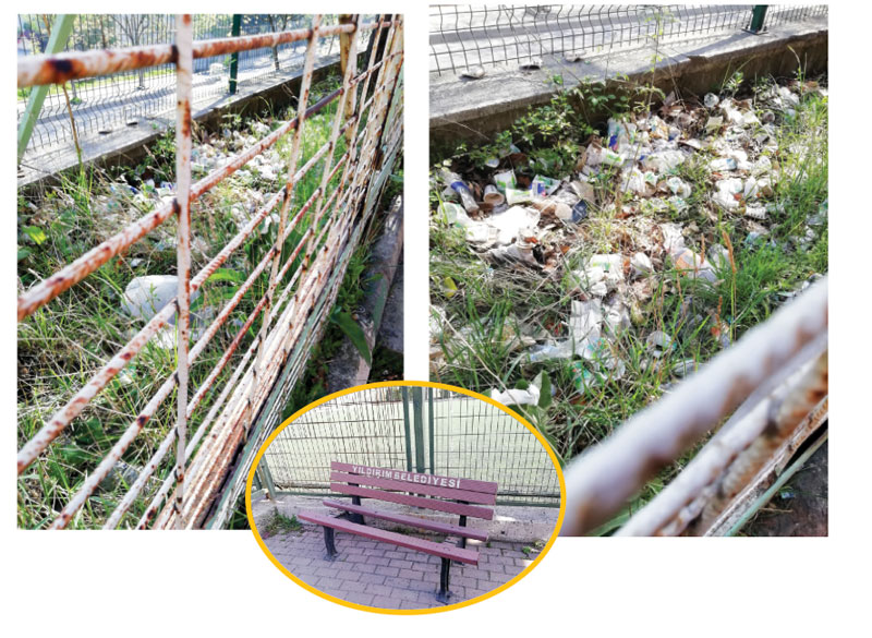 Öğrenciler, geri dönüşüm kutusu olmadığından veya çöp kutusu sıkıntısından herhalde kantin yanındaki demir parmakların ötesine bütün pet şişe ve bardakları toplamaya çalışmışlar galiba.