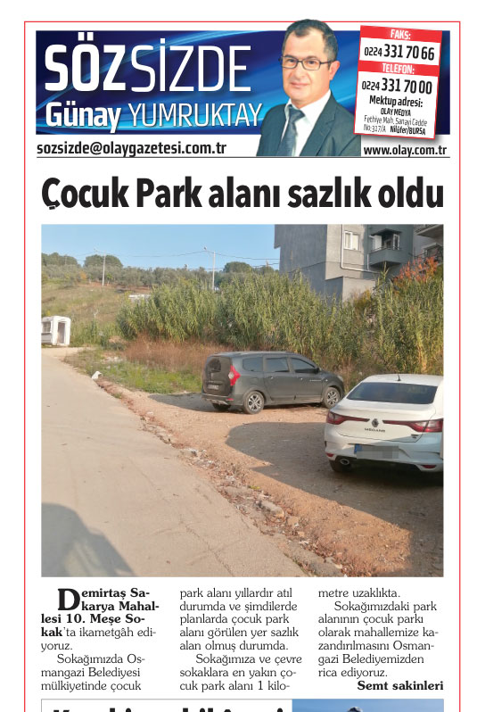 Sayın Günay Yumruktay, Olay gazetesi 16 Aralık 2020 tarihli Söz Sizde köşesinde “Çocuk Park Alanı Sazlık Oldu” başlıklı okur şikâyetine yer verilmiştir.
