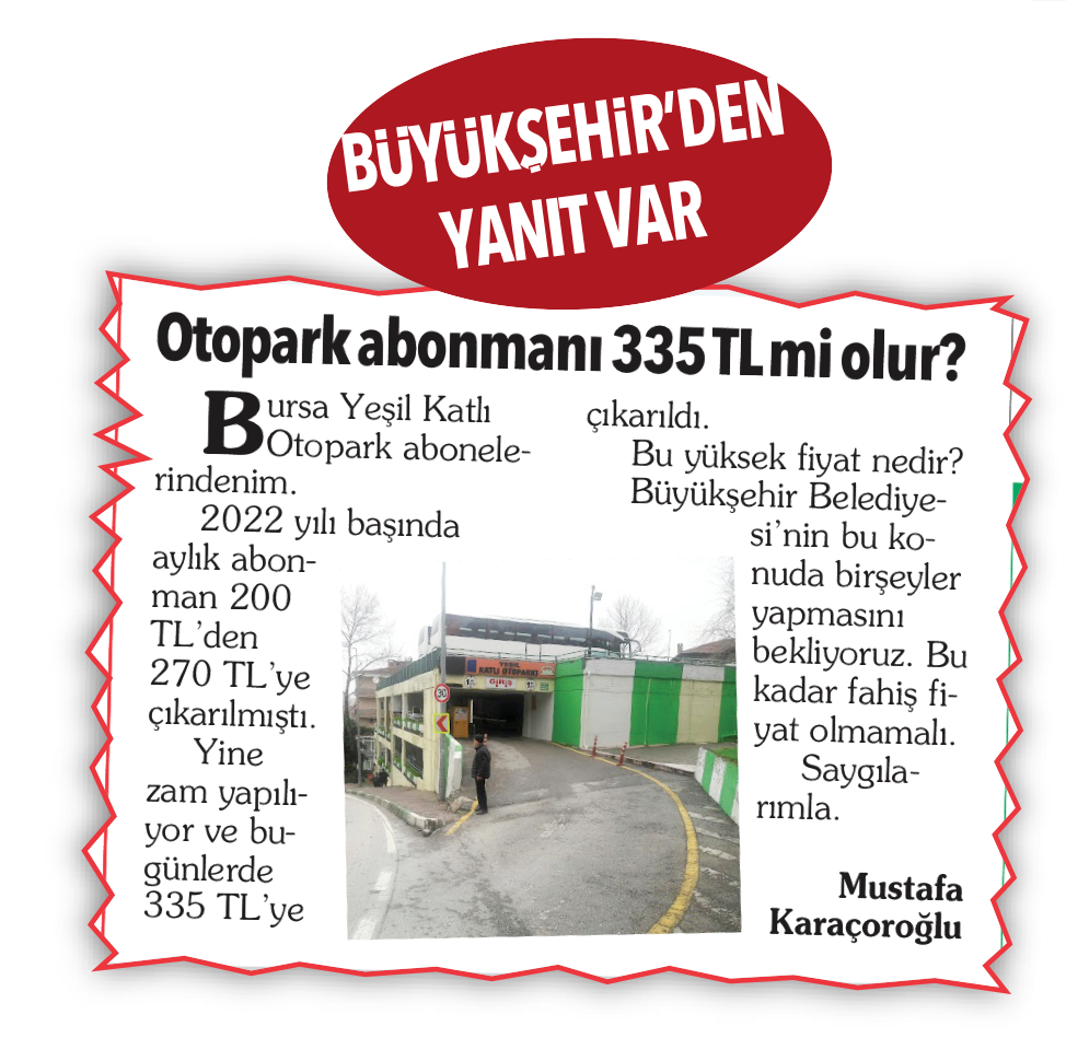 Sayın Günay Yumruktay, 20 Nisan 2022 tarihli Olay gazetesi Söz Sizde köşenizde yayımlanan “Otopark Abonmanı 335 TL mi olur?” başlıklı konu, kurumumuz ilgili birimi tarafından incelenmiştir.