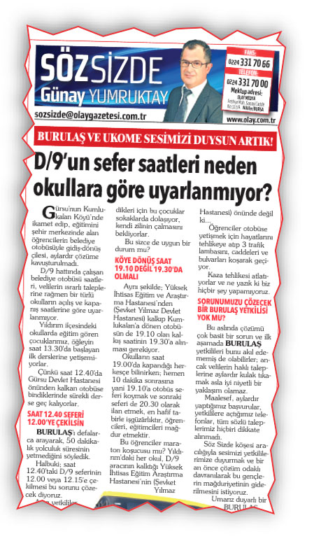 Sayın Günay Yumruktay, 6 Ocak 2022 tarihinde Söz Sizde köşesinde “D/9’un Sefer Saatleri Neden Okullara Göre Uyarlanmıyor?” başlığıyla yayımlanan yazınız ile ilgili olarak D/9 hattıyla ilgili gelen talepler doğrultusunda; 12.40 sefer saatinin saat 12.00 ye alındığını ve 19.10 sefer saatinin de 19.30 olarak değiştirildiğini iletmek isteriz.