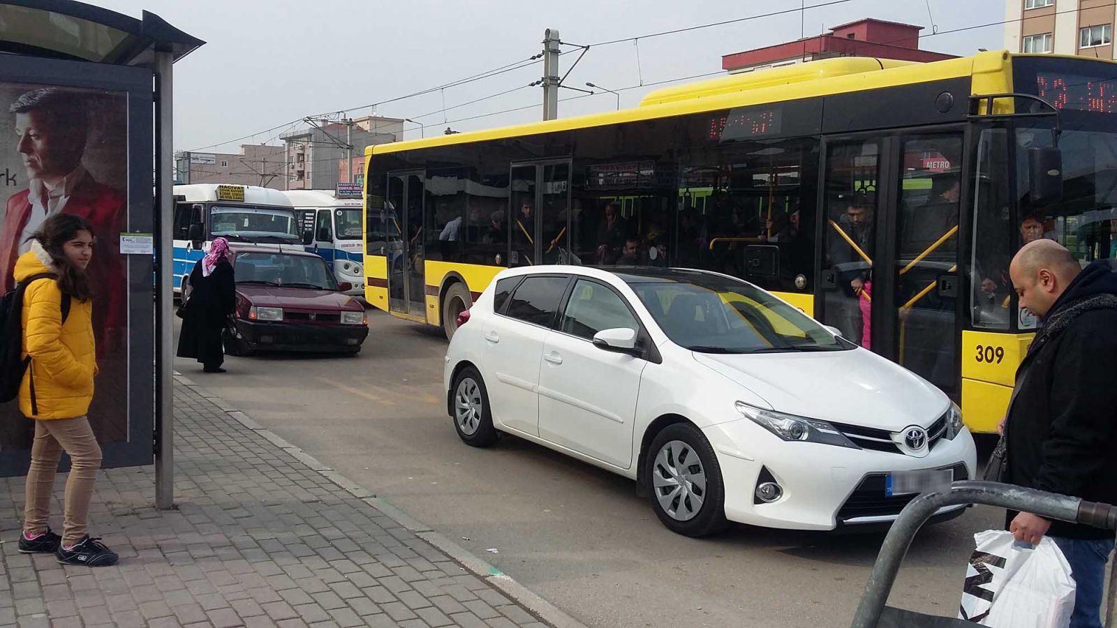 Bu fotoğraf karesi Arayatağı’ndan… Görüldüğü gibi otobüs durağına iki özel araç park etmiş, belediye otobüsü de durağa yanaşamadığı için yolun ortasında -mecburen- yolcu indirip bindiriyor. Şehrin pek çok noktasında bu tür manzaralarla karşılaşıyoruz maalesef. Beklentimiz, artık bu ilkelliğin son bulması. Bu noktada bir önerim olacak. Özellikle yoğun yolcu trafiğinin olduğu noktalarda, duraklarda kameralar yardımıyla kontroller yapılsın ve cezalar yazılsın. Başka türlü bu işin düzeleceği yok. Olay sadece durağı işgal etmek değil. Bir de can güvenliği boyutu var ki, asıl önemli olan bu. Yolcuyu yolun ortasında indirip bindirmek zorunda kalmak ne demek… Yetkililerden bu sorunu çözüm bulmalarını bekliyoruz.