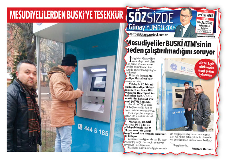 2 Şubat 2022 tarihli Söz Sizde köşesinde “Mesudiyeliler BUSKİ ATM’sinin Neden Çalıştırılmadığını Soruyor” başlığıyla yer verilen yazımızın hemen akabinde çok kısa bir sürede BUSKİ tarafından, İnegöl Mesudiye Mahallemizdeki BUSKİMATİK’in elektrik bağlantısını sağlayarak hizmete sunmuştur.