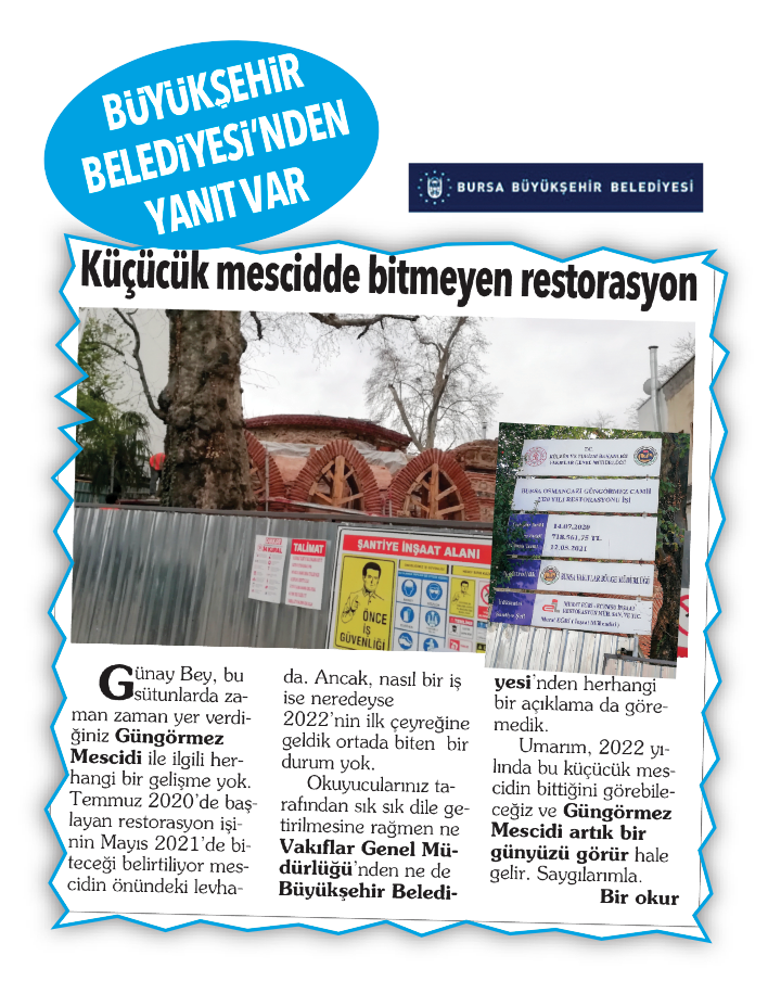 Sayın Günay Yumruktay, 12 Mart 2022 tarihli Olay Gazetesi Söz Sizde köşenizde yayımlanan, “Küçücük Mescidde Bitmeyen Restorasyon?” başlıklı konu, kurumumuz ilgili birimi tarafından incelenmiştir.