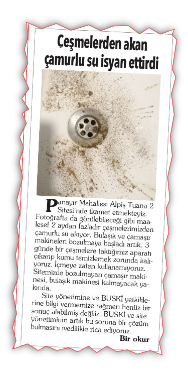 Bahsi geçen gazete küpürüne konu olan adreste içme suyu numunesi alınarak su analizleri yapılmıştır.