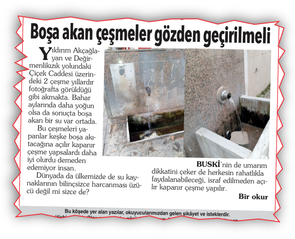 İlgili yazıda, “…Yıldırım Akçağlayan ve Değirmenlikızık yolundaki Çiçek Caddesi üzerindeki iki çeşme yıllardır boşa akmaktadır. Bu çeşmeleri yapanlar keşke açılır kapanır yapsalardı…” denilmektedir.