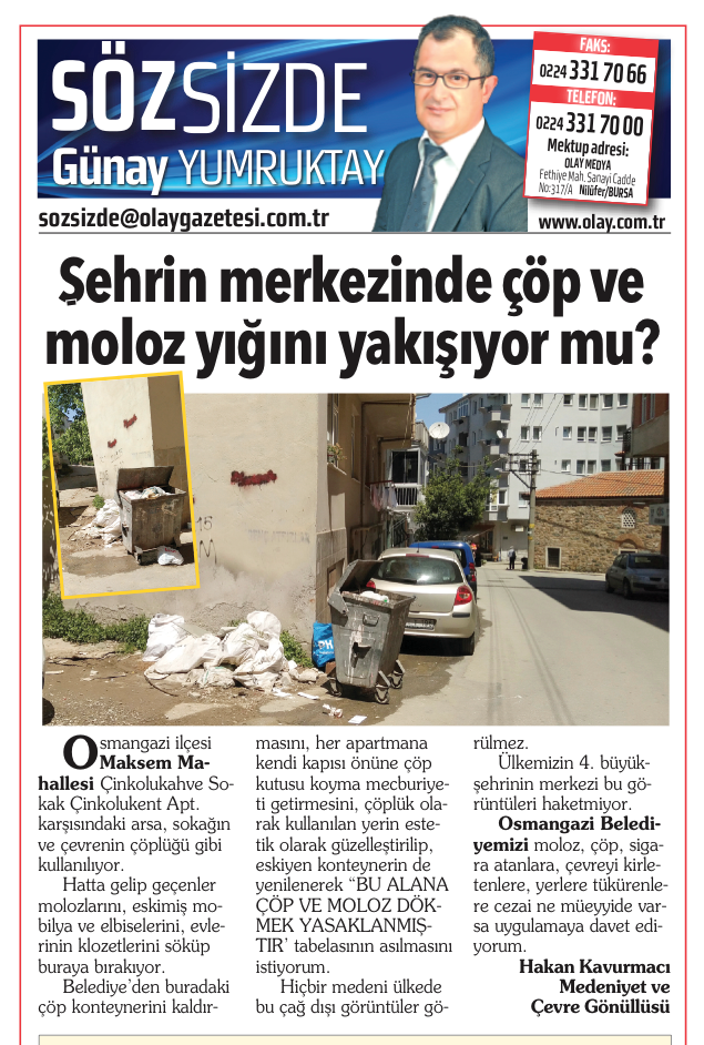 Sayın Günay Yumruktay, Olay gazetesinin 12 Mayıs 2021 tarihli Söz Sizde köşesinde ‘Şehrin Merkezinde Çöp ve Moloz Yığını Yakışıyor Mu?’ başlıklı bir şikâyete yer verilmiştir.