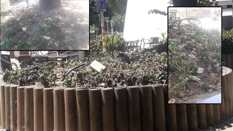 Günay Bey, Merinos Park’ta kafe çevresindeki çiçekliklerde bulunan yeşillikler, çiçekler susuzluktan kurumuş, bitmiş durumda.