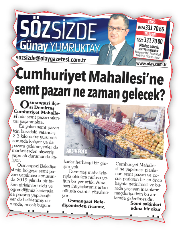 Sayın Günay Yumruktay, Olay gazetesinin 23 Ocak 2020 tarihli Söz Sizde köşesinde ‘Cumhuriyet Mahallesi’ne Semt Pazarı Ne Zaman Gelecek?’ başlıklı okur yazısına yer verilmiştir.