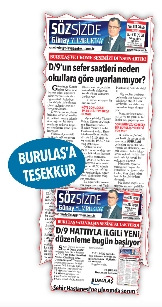 Vatandaşın talebine gösterdiği duyarlılık ve sorunu hemen çözerek uygulamaya sokmasından dolayı BURULAŞ’a ve onlarca ailenin sesi olduğunuz, mağduriyetin giderilmesine vesile olduğunuz için Olay gazetesine ve size teşekkür ederiz.