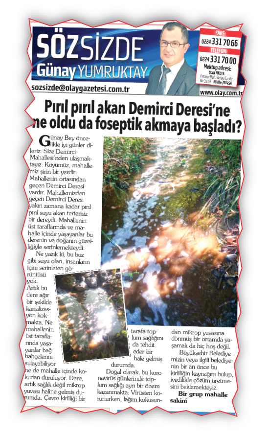 Vatandaşın sesi olan Söz Sizde köşesinde 7 Ağustos 2020 tarihinde “Pırıl Pırıl Akan Demirci Deresi’ne Ne Oldu da Foseptik Akmaya Başladı?” başlığıyla mahallemizdeki Demirci Deresi ile ilgili sorunumuzu yayımlamıştınız.