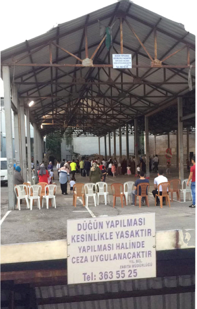 Fotoğrafta da görülebileceği gibi buranın üzerinde bir de tabela var: “Düğün yapılması kesinlikle yasaktır. Yapılması halinde ceza ugyulanacaktır.” Düğünü yapan bu yazıyı görüyor, zabıta görüyor, bizler görüyoruz. Buna rağmen nasıl yapılıyor? Çevre mahallelerden gelip düğün yapılıyor.