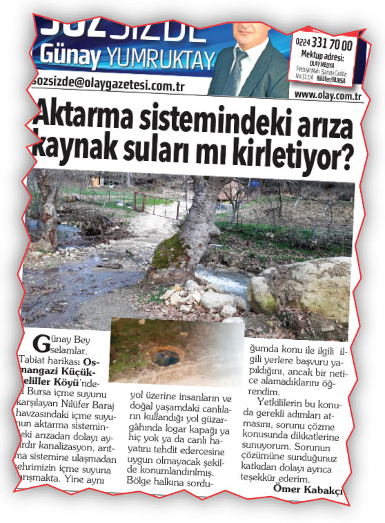 Sayın Günay Yumruktay, 3.3.2021 tarihli Olay gazetesi Söz Sizde köşesinde yayımlanan “Aktarma Sistemindeki Arıza Kaynak Suları mı Kirletiyor?” başlıklı haber, kurumumuz ilgili birimi tarafından incelenmiştir.