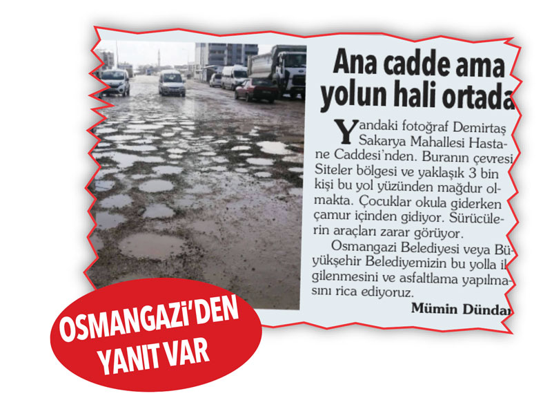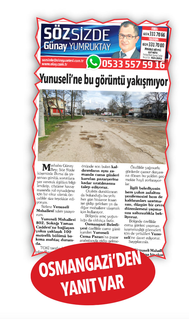 Sayın Günay Yumruktay, Olay gazetesinin 17 Mart 2022 tarihli Söz Sizde köşesinde ‘Ana Cadde Ama Yolun Hali Ortada’ başlıklı bir şikâyete yer verilmiştir.