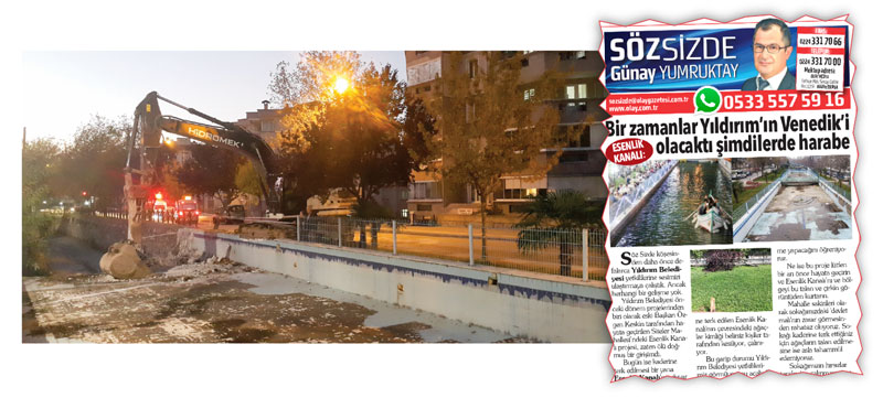 Anlaşılan o ki, bölge sakinlerinin ve okurunuzun gündeme getirip, sizin de köşenizde sesimiz olmanızla Yıldırım Belediyesi nihayet bu Esenlik Kanalı’nda bir çalışma yapmaya karar vermiş. Bu anlamda geç de olsa konuya el attığı için öncelikle Yıldırım Belediyesi’ne teşekkür ederim.
