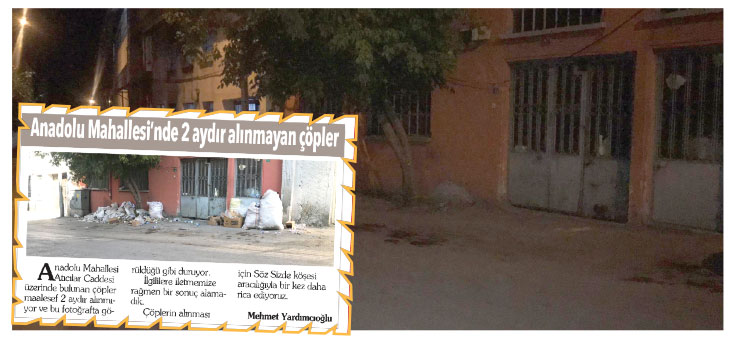 29 Ağustos 2020 tarihinde Söz Sizde köşesinde “Anadolu Mahallesi’nde 2 Aydır Alınmayan Çöpler” başlığıyla yayımlanan yazımız üzerine Yıldırım Belediye ekipleri kısa sürede gelerek çöpleri ve molozu kaldırdı. İlgi ve duyarlılıklarından dolayı Yıldırım Belediyemize teşekkür ederim.