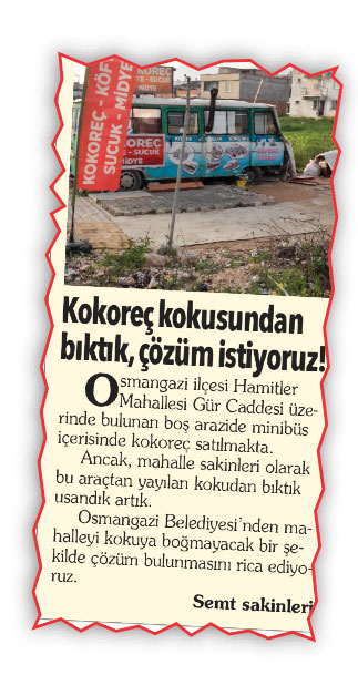 Sayın Günay Yumruktay, Olay gazetesinin 16 Mayıs 2021 tarihli Söz Sizde köşesinde ‘Kokoreç Kokusundan Bıktık, Çözüm İstiyoruz!’ başlıklı bir şikâyete yer verilmiştir.