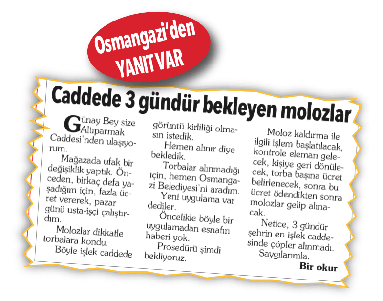 Sayın Günay Yumruktay, Olay gazetesinin 2 Temmuz 2021 tarihli Söz Sizde köşesinde ‘Caddede 3 Gündür Bekleyen Molozlar’ başlıklı bir şikâyete yer verilmiştir.
