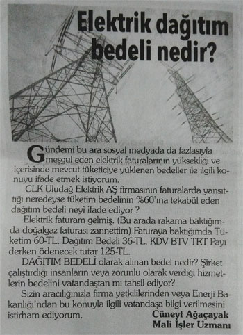 Ayrıca şirketimiz sadece sayaç üzerinde yapılan okumaya ait tüketimi fatura etmek ile yükümlü olup; faturalardaki birim bedeller, tüketimin yapıldığı döneme ait Enerji Piyasası Düzenleme Kurumu tarafından yayımlanan tarife üzerinden belirlenmektedir.