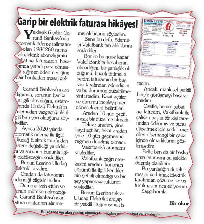 Sayın Günay Yumruktay, 9 Mart 2021 tarihli, “Garip Bir Elektrik Faturası Hikâyesi” başlığıyla gazeteniz Söz Sizde köşesinde yayımlanan okur talebi tarafımızca incelenmiştir.
