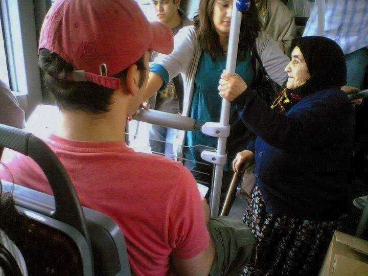Liseli ve üniversiteli gençler koltuklarında rahat otururken anne ve babası yaşındaki insanlar ayakta gitmekte. Gençler ellerinde birer cep telefonu ile oyalanmakta, yanlarına gelen bebekli kadınlara dahi yer vermemekte.