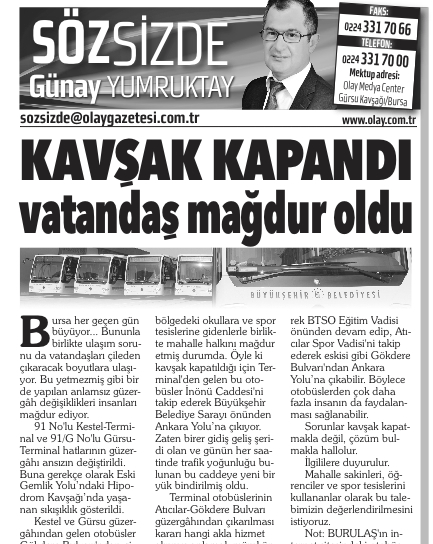 Sayın Günay Yumruktay, 12 Ocak 2017 tarihinde Söz Sizde köşenizde yayımlamış olduğunuz “Kavşak kapandı vatandaş mağdur oldu” okur şikâyeti ile Zafer Mahallesi olarak mağduriyetimizi belirtmiştik.
