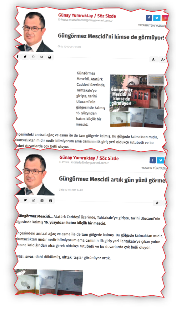 Şöyle ki; 10.10.2017 tarihinde bu sütunlarda “Güngörmez Mescidi’ni Kimse de Görmüyor!” ve yine 13.01.2019 tarihinde “Güngörmez Mescidi Artık Gün Yüzü Görmeli” başlıklarıyla okur yazılarınız yayımlandı.