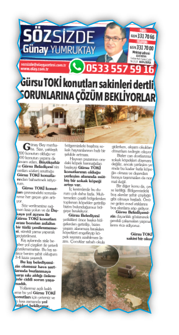 24 Mart 2022 tarihli Söz Sizde köşenizde “Gürsu TOKİ Konutları Sakinleri Dertli, Sorunlarına Çözüm Bekliyorlar” başlığıyla bölgemizdeki sorunları anlatan bir yazımızı yayımlamıştınız.