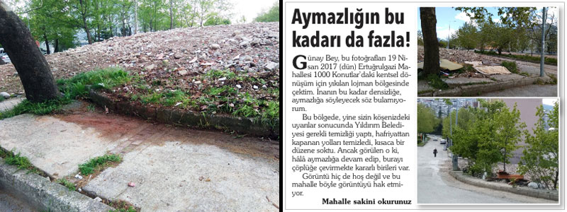 20/4/2017 tarihli köşenizde yayımlanan “Aymazlığın Bu Kadarı da Fazla” başlıklı haberde bahsedilen Ertuğrulgazi Mahallesi Bin Konutlar bölgesinde Belediyemiz Temizlik İşleri Müdürlüğü ekiplerince gerekli temizlik çalışması ivedilikle yapılmıştır.