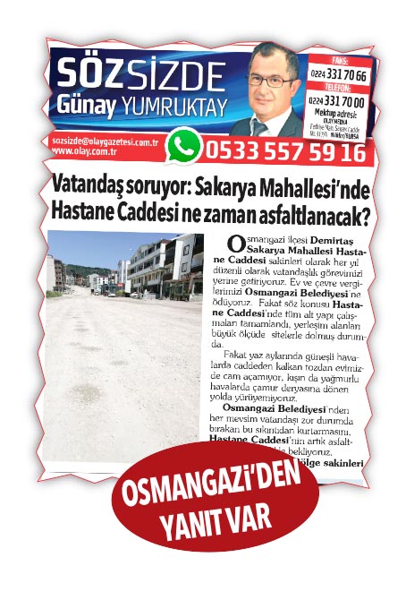 Sayın Günay Yumruktay, Olay gazetesinin 19 Haziran 2022 tarihli Söz Sizde köşesinde ‘Vatandaş Soruyor: Sakarya Mahallesi’nde Hastane Caddesi Ne Zaman Asfaltlanacak?’ başlıklı bir şikâyete yer verilmiştir.