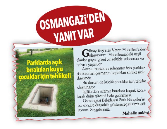 Sayın Günay Yumruktay, Olay gazetesinin 24 Haziran 2022 tarihli Söz Sizde köşesinde ‘Parklarda Açık Bırakılan Kuyu Çocuklar İçin Tehlikeli’ başlıklı bir şikâyete yer verilmiştir.
