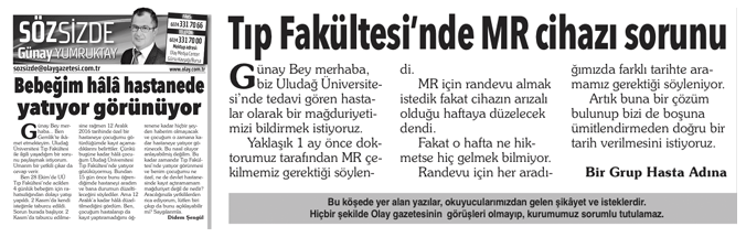 6 Aralık 2016 “Tıp Fakültesi’nde Manyetik Rezonans Görüntüleme Cihazı Arızası” başlıklı yazınıza istinaden, belirtmek isteriz ki, son 1 yılda ve halen Uludağ Üniversitesi Tıp Fakültesi’nde 2 (iki) adet Manyetik Rezonans (MR) Görüntüleme cihazı kesintisiz olarak çalışmaktadır. Uludağ Üniversitesi Tıp Fakültesi’nde son bir yılda yeni bir Manyetik Rezonans Görüntüleme cihazı alınmış ve hizmete girmiştir. Acil Radyoloji Ünitesi’nde Acil Servis’e başvuran hastalara 24 saat kesintisiz Manyetik Rezonans Görüntüleme, Bilgisayarlı Tomografi ve Ultrasonografi hizmeti verilmektedir. Hastanemizde manyetik görüntüleme hizmetlerinin daha yeterli seviyeye çıkarılması için 2014 yılından başlayarak özel bir sağlık firmasıyla hizmet alım anlaşması yapılarak randevu sürelerinin azaltılması sağlanmıştır.