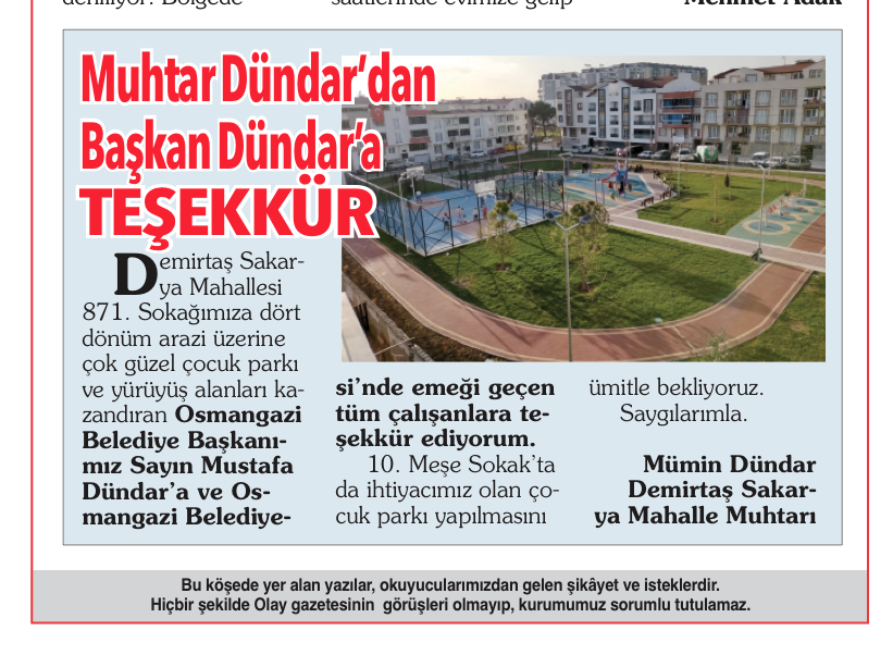 Sayın Günay Yumruktay, Olay gazetesi 6 Ocak 2021 tarihli Söz Sizde köşesinde “Muhtar Dündar’dan Başkan Dündar’a Teşekkür’ başlıklı okur yazısında yer verilen talep incelenmiştir.