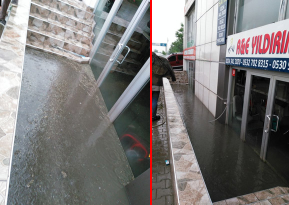 Otosansit’teki Yeni Galericiler Sitesi’ndeki işyerim ve komşu işyeri her yağmur yağdığındaki hali fotoğraftaki gibi. Ofisin içi dışı yukarıdaki dükkânların sanayi yağları, kanalizasyon pisliği olduğu gibi dükkânımın önündeki giderden dışarı fışkırarak işyerimi bu hale getiriyor. Gider borularının yetersiz olduğu belli ancak bu mağduriyetimin giderilmesi için maalesef bir yetkili bulamıyorum. Çünkü herkes birbirine paslıyor. Ne yapacağımı şaşırdım. İki yıldır bu işyerindeyim ve en az 10 defa ben bu yaşadım. Her defasında ofis mobilyalarımı değiştirmek zorunda kaldım. Kooperatif yetkilileriyle, müteahhit firma ile BUSKİ ile görüştüm ama ne yazık ki bugüne kadar bir sonuç alamadım. İvedilikle gider borularının yenilenmesi gerekiyor.