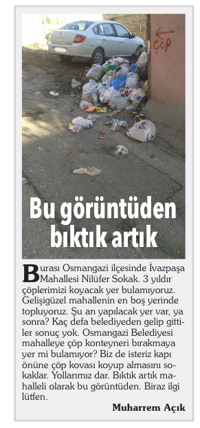 Olay gazetesinin 3 Mayıs 2017 tarihli Söz Sizde köşesinde ‘Bu Görüntüden Bıktık’ başlıklı bir şikâyete yer verilmiştir.