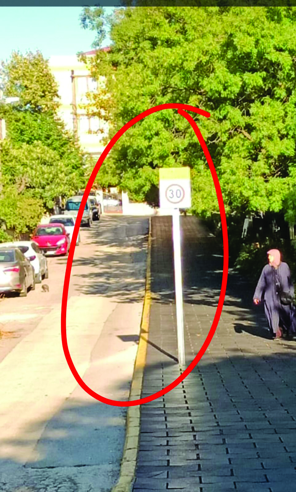 Fotoğraflar Konak Mahallesi Kır Sokak’taki Saim Tuna yürüyüş yolundan. Yola tabela konulmuş. Buradan gelip geçen vatandaşlar bu tabelaya çarpıyor. Öte yandan bölgede anaokulu var. Bu yol üzerine sürücülerin dikkatli olması adına uyarı ikaz çizgileri veya kasis yapılmalı.
