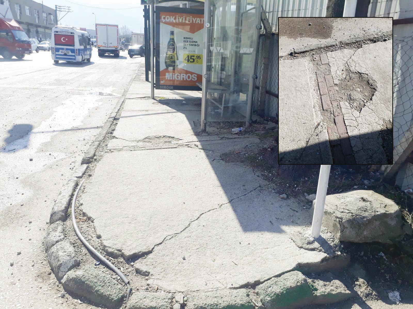 Fotoğrafta da görüldüğü gibi kaldırımdan bir engellinin geçmesi imkânsız. Çünkü durak kaldırımı tamamen kapatmış durumda.