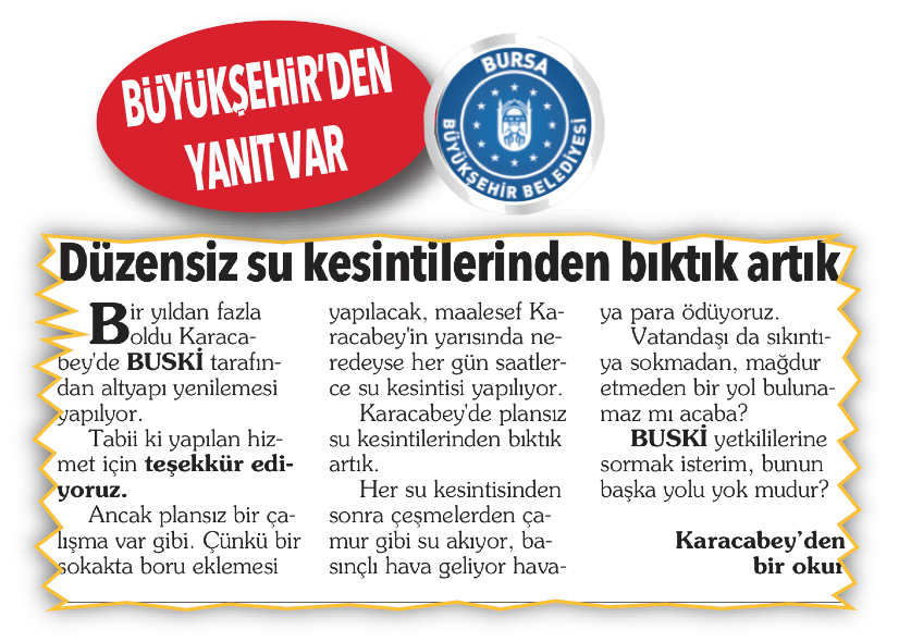 Sayın Günay Yumruktay, 17 Haziran 2021 tarihli Olay Gazetesi Söz Sizde köşesinde yayınlanan “Düzensiz Su Kesintilerinden Bıktık Artık” başlıklı konu, kurumumuz ilgili birimi tarafından incelenmiştir.