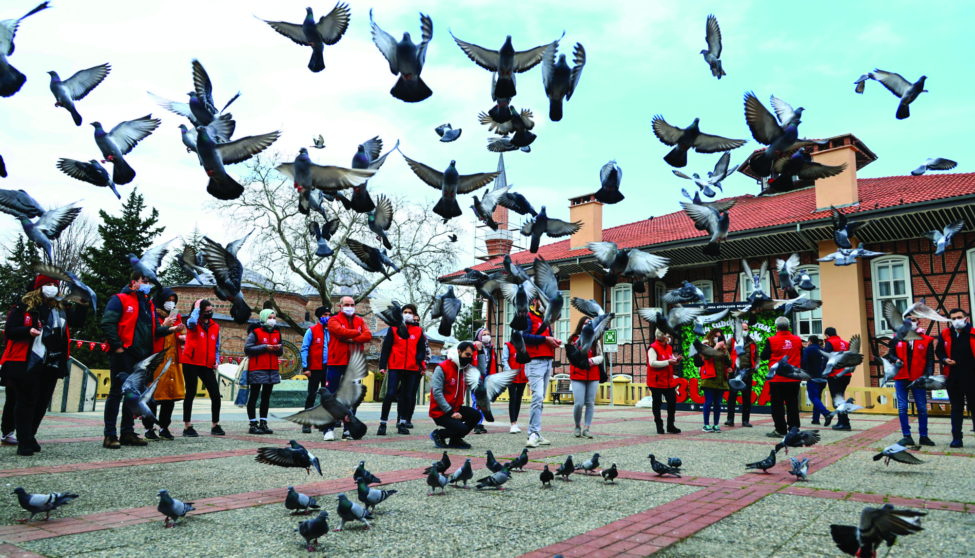 Büyükşehir Belediyesi’nin ‘gönüllü hareketine’ katılıp, özellikle sokağa çıkma kısıtlaması uygulanan hafta sonları sokak hayvanlarının beslenmesi faaliyetlerinde görev alan Mahalle Gönüllüleri, sessizliğe bürünen meydanlardaki kuşları besledi.
