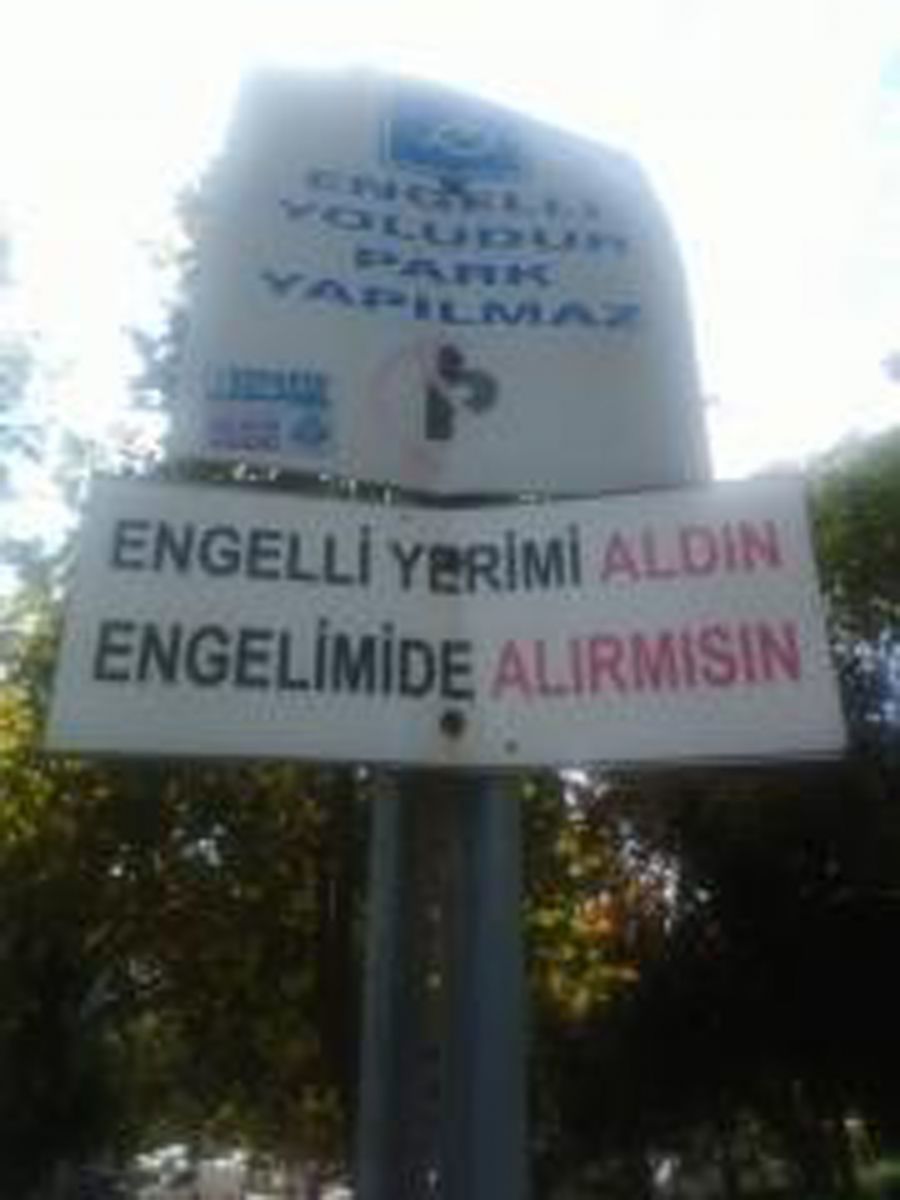 Sürücülerin araçlarını park ederken engelliler için ayrılan alana da girmeleri tek kelimeyle vicdansızlık. Engelli alanlarının bu şekilde işgaline Mudanya’ dan anlamlı bir sitem var. Meydanda olan bir tabela. Engellinin isyanını yansıtmakta: Engelli yerimi aldın. Engelimi de alırmısın… Genel davranışımız maalesef bu. Sadece şunu söylemekle yetinelim. Tabii anlayana… Sürücü arkadaş boş bulduğun yere dalarsın, bir gün gelir sen de engelli olursan, hak hukuk nedir anlarsın.