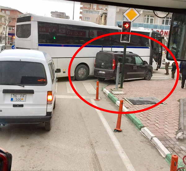 Fotoğraftaki yer, Erikli’de Ziraat Bankası önü. Yapılan hatalı ve yasak bir park etme şekli. Sürücüleri çileden çıkarmaya, trafiği altüst etmeye yetiyor.