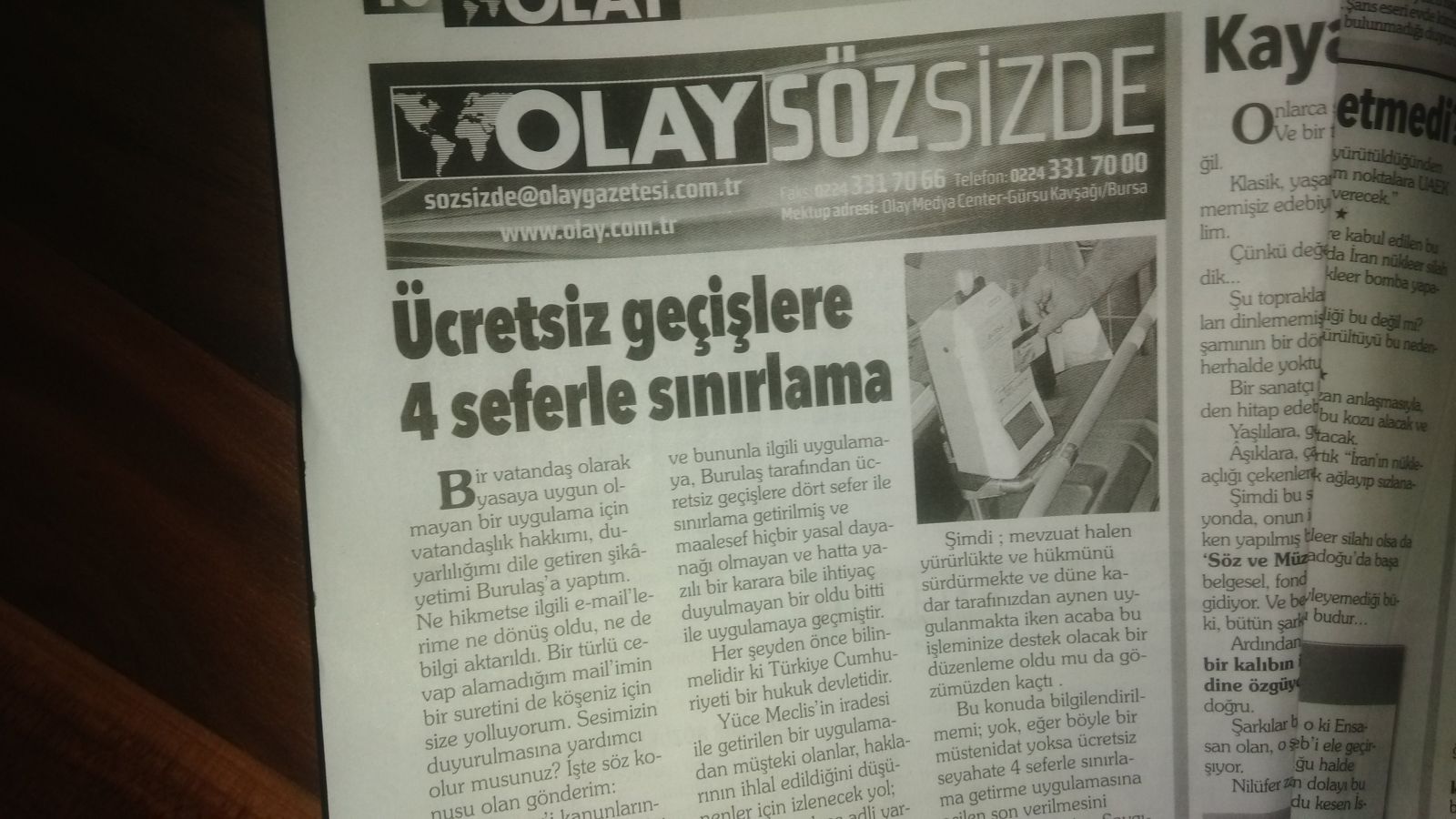 Engellilerin ücretsiz geçişlerine 4 seferle getirilen sınırlamayı 4 Nisan Cumartesi günü duyurmuş, yaşanan sıkıntıları aktarmıştık. Okurumuz Oktay Özyurt’ un Burulaş’a hitaben “hiçbir yasal dayanağı olmayan ve hatta yazılı bir karara bile ihtiyaç duyulmayan bir oldu bitti ile uygulamaya geçilmiştir” diyen sözlerini de içeren soruna genel hatlarıyla yer vermiştik. Bu arada engelli dernekleri de basın açıklaması yapmışlardı.